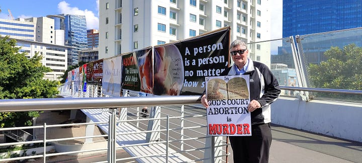 As I set up the first banner on the pedestrian bridge: a person is a person no matter how small, a young woman walked up to me and declared: “I am a Christian and I find your banner offensive!” While I was wondering what could possibly be offensive about that factual statement, two young men strode up to me and shouted: “what a pity your mother didn’t abort you!”